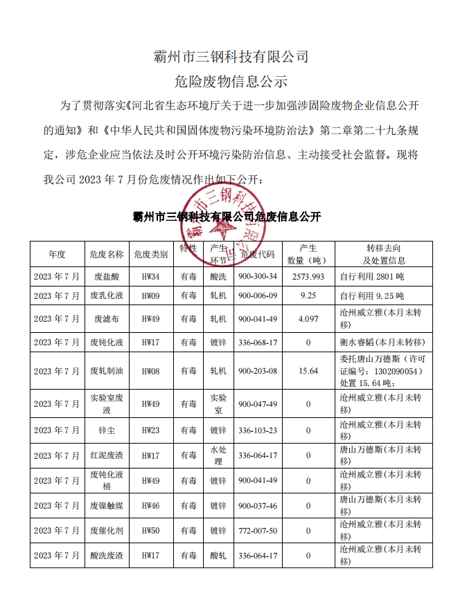 霸州市三鋼科技有限公司7月危險廢物信息公示